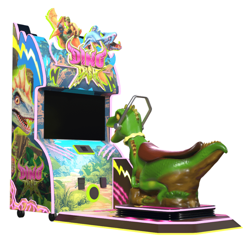 Interactive dino-themed racing game. Steer with reins, dash through prehistoric worlds, ticket or amusement play.