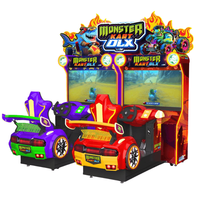 Twin racing cabinet with 55” screens, motion-platform seats, linkable up to 6 units, multiple characters and tracks.